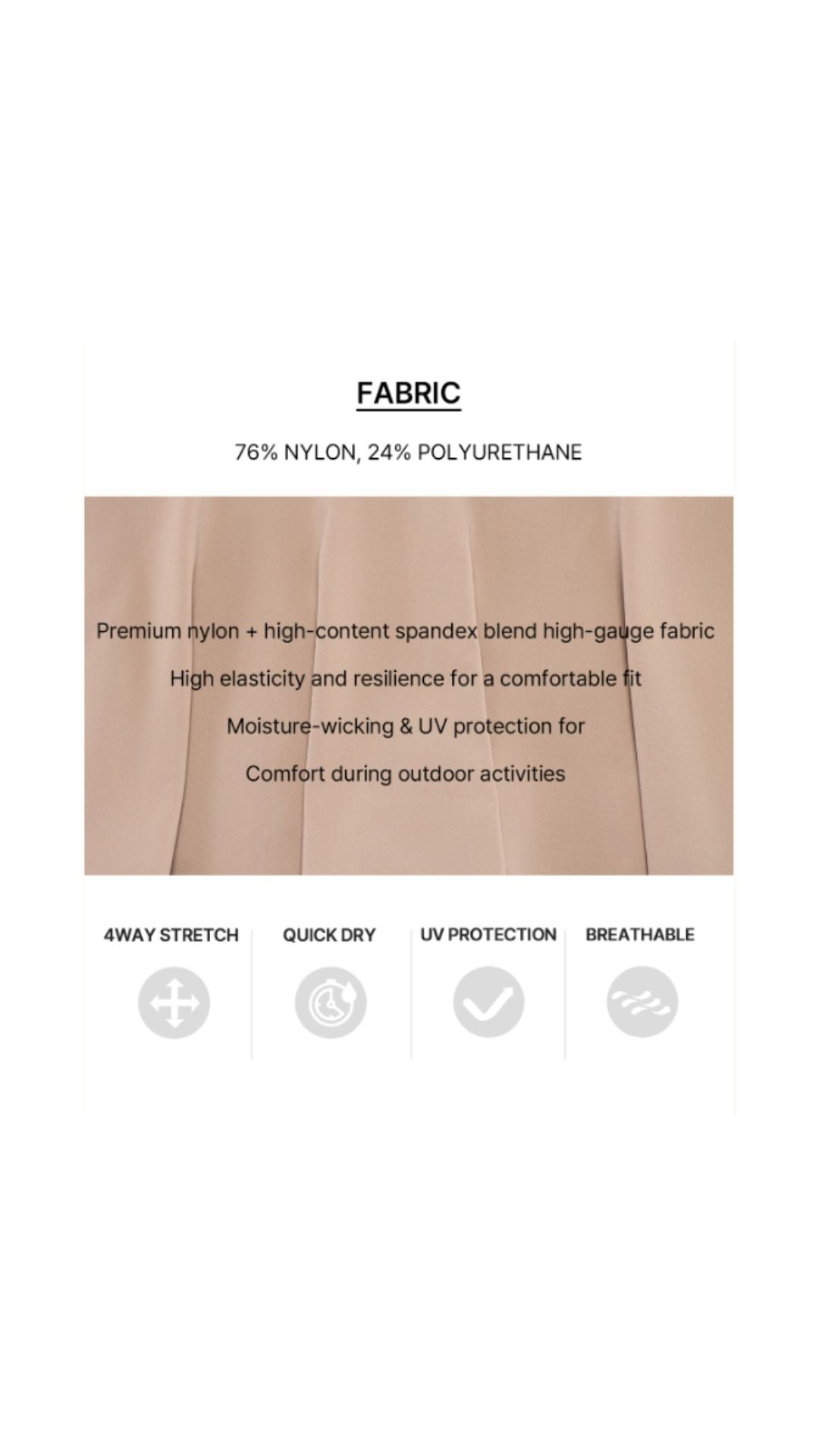 Made from a high-gauge fabric blended with premium nylon and high-content spandex, this functional yarn offers excellent stretch and recovery, along with moisture-wicking and UV protection, ensuring comfortable and breathable wear even during outdoor activities.