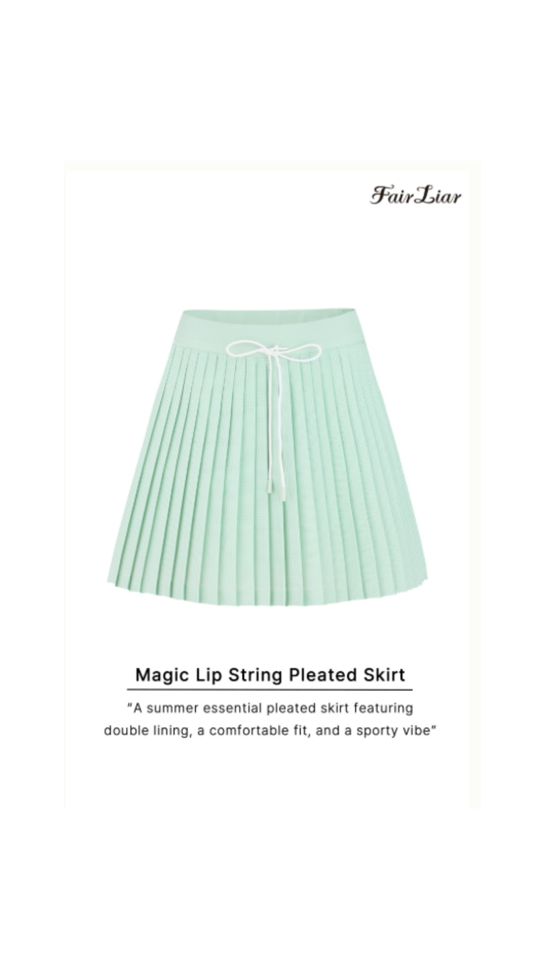 Founded in Seoul in 2017, Fair Liar is a women’s golfwear brand that blends fashion with function. Our collections bring a refined, feminine take on golf apparel — designed to perform on the course and look effortless off it. Every piece is crafted with premium materials and tested for performance standards, so you never have to compromise style for function. Learn more on our about our quality here.