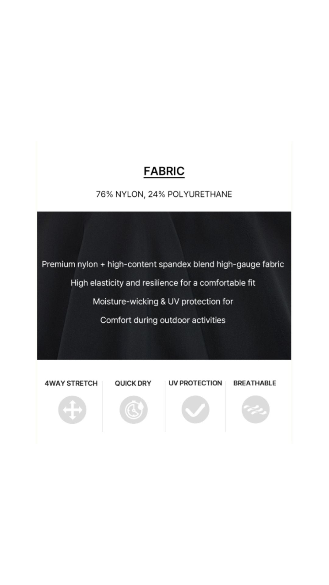 Made from a high-gauge fabric blended with premium nylon and high-content spandex, this functional yarn offers excellent stretch and recovery, along with moisture-wicking and UV protection, ensuring comfortable and breathable wear even during outdoor activities.