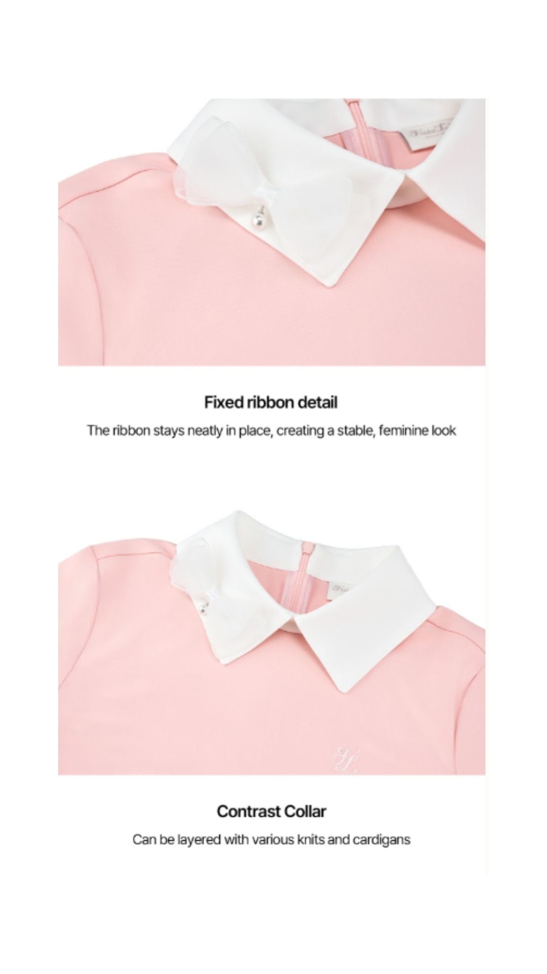 2. The black and white color scheme creates a sophisticated and elegant vibe, while the ribbon detail on the collar adds a feminine touch. The slit detail on the sleeves adds a subtle accent, completing a classic yet trendy style.