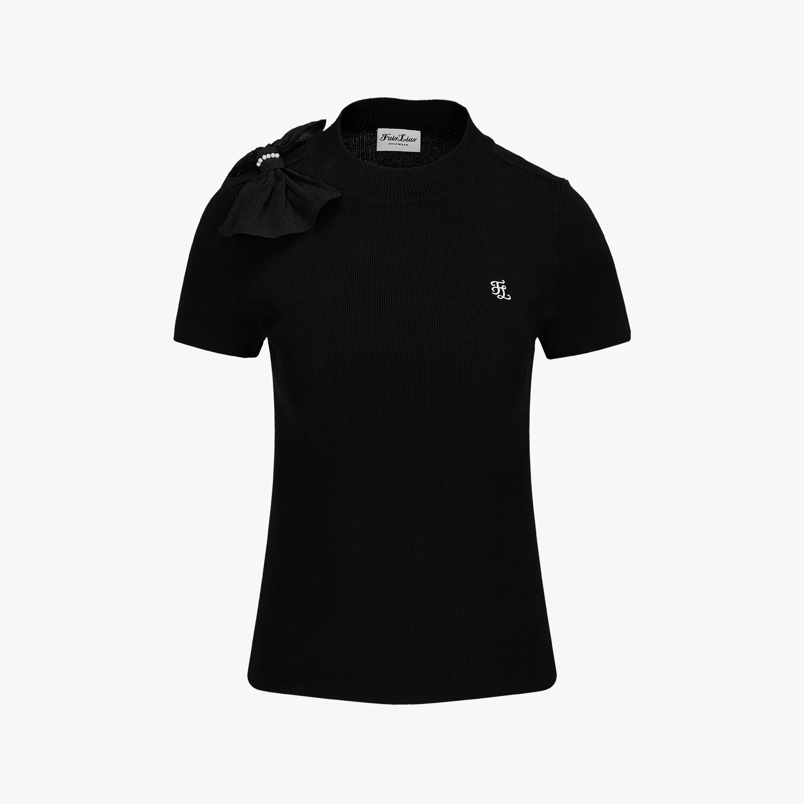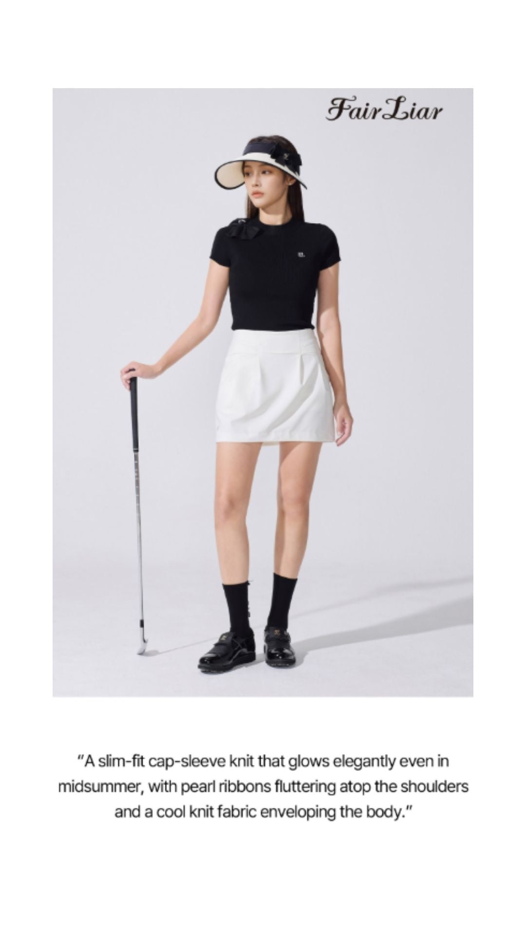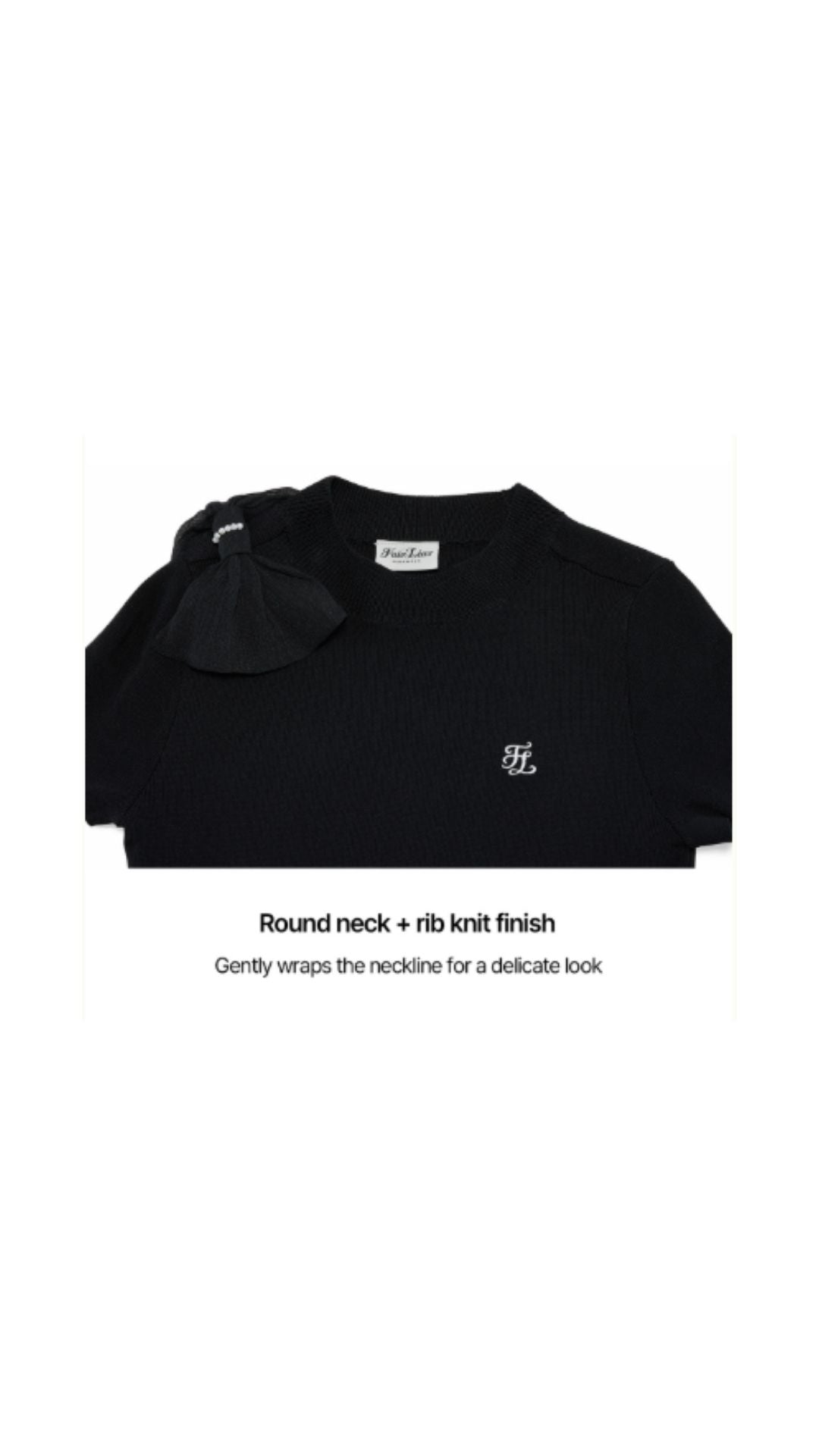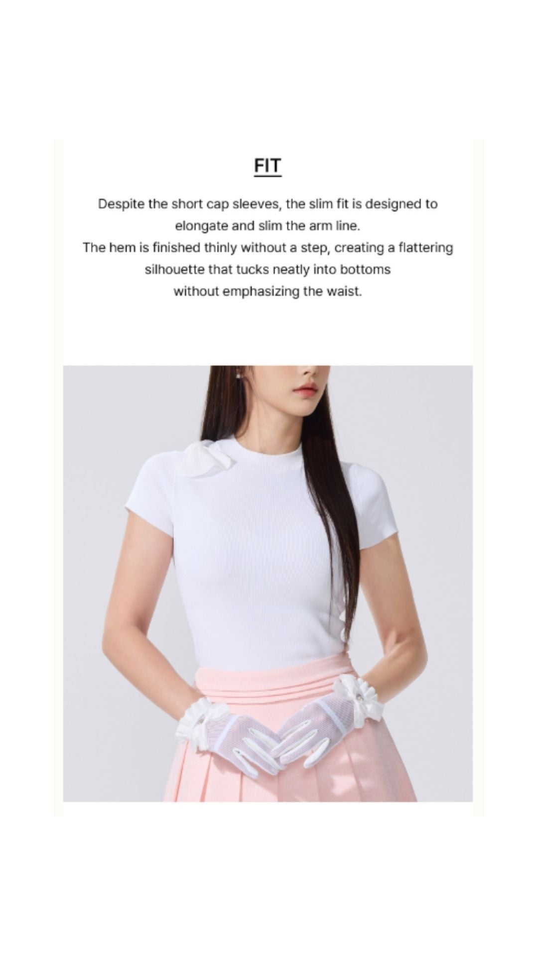 1. Made from a moisture-wicking and breathable rayon-nylon blend yarn, this fabric ensures comfort and breathability even in hot weather. 2. A large ribbon decoration on the right shoulder emphasizes femininity, with pearl details at the center of the ribbon adding a touch of elegance. 3. Slim Fit