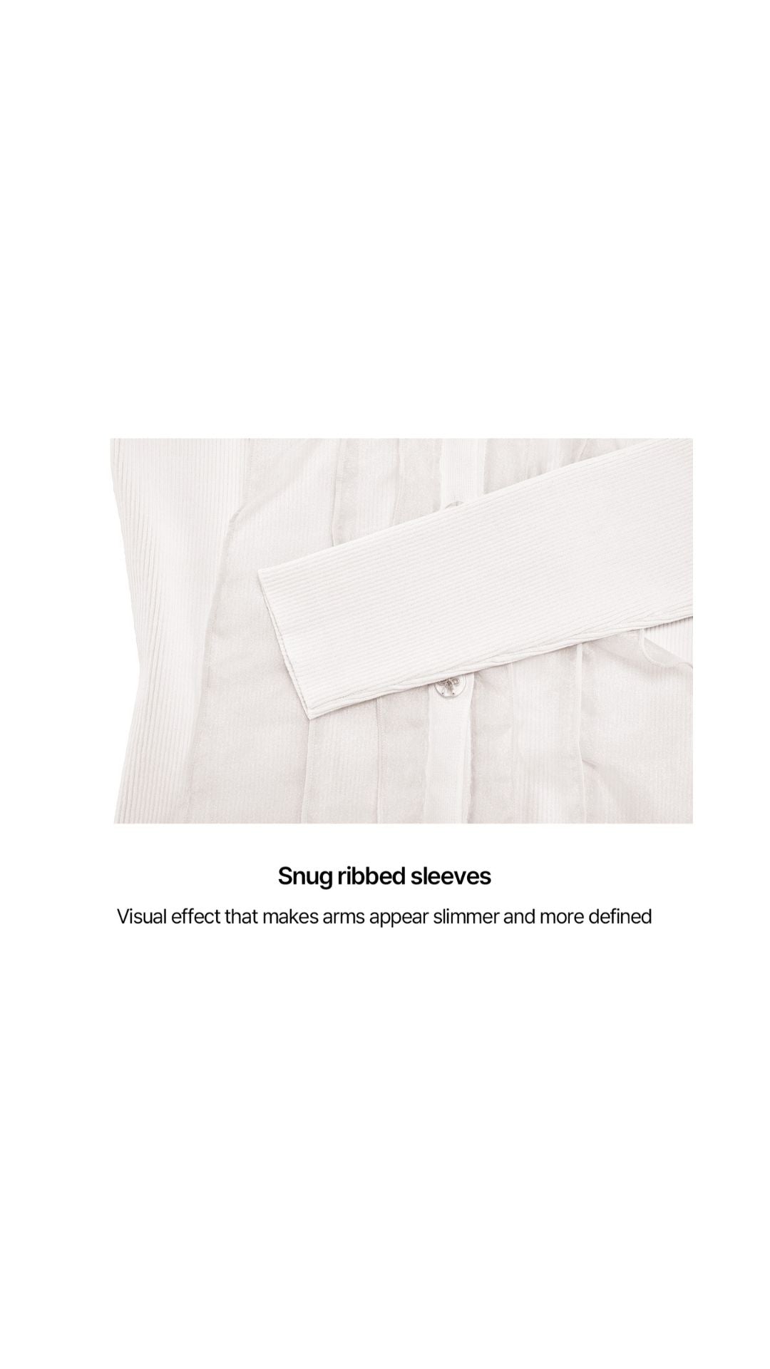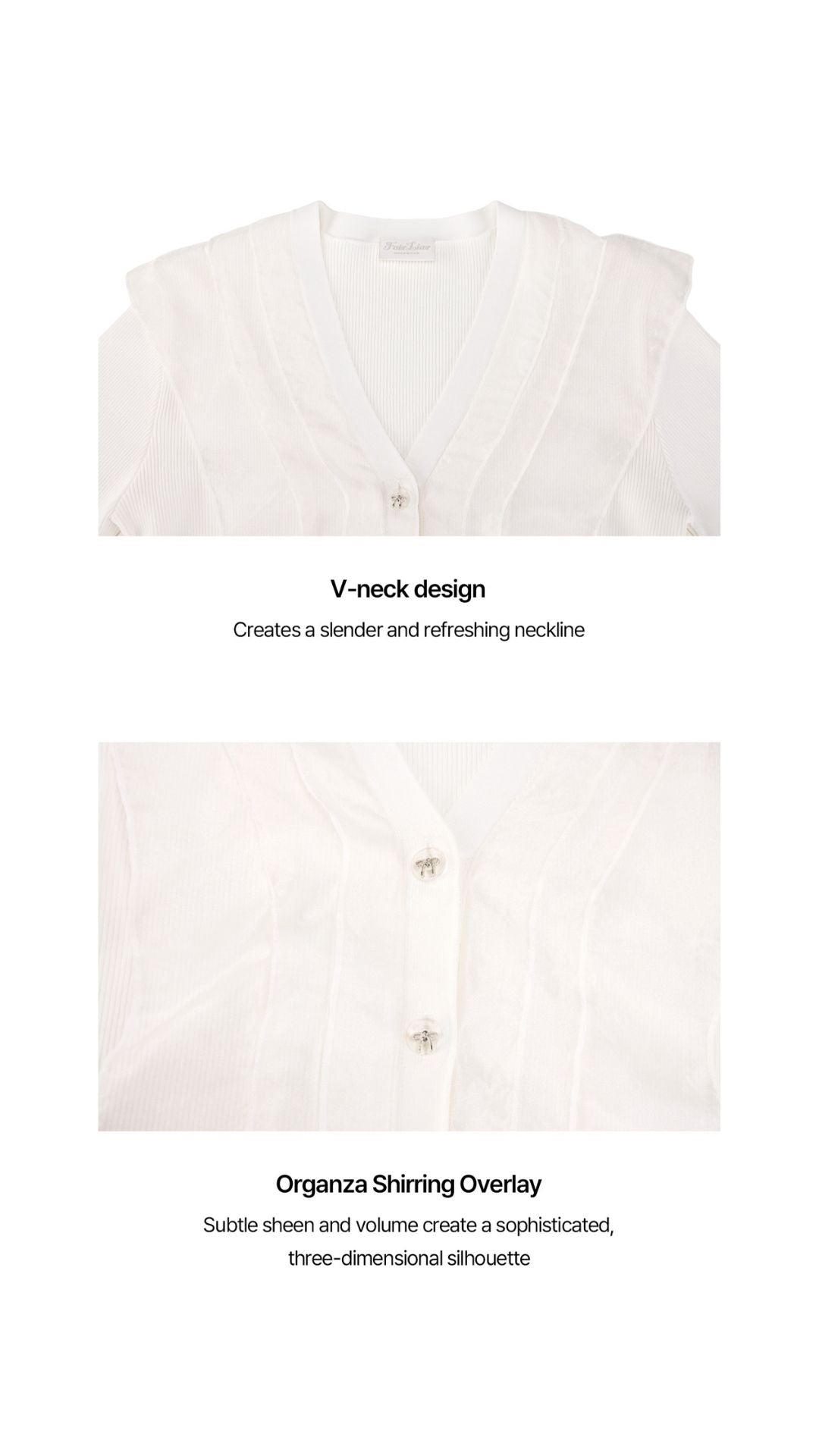 2. An organza shirring fabric is layered over a V-neck knit cardigan to create a voluminous and three-dimensional silhouette. The subtle sheen and volume add a feminine and elegant vibe to the design, making it a standout piece on its own.