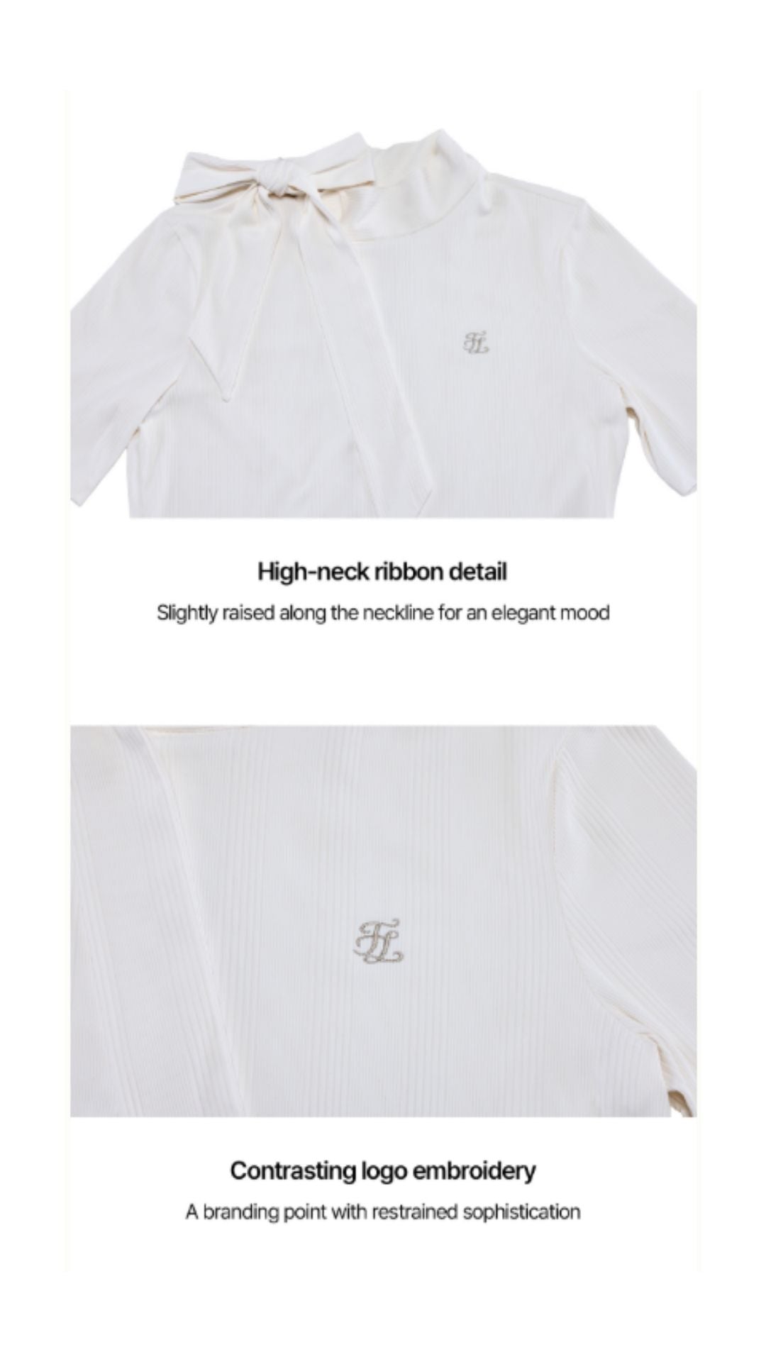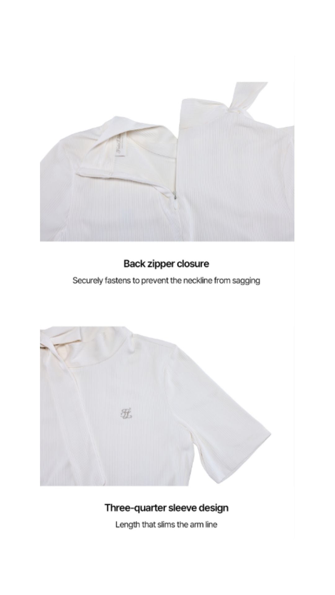 1. This summer golf wear features a high neck with a ribbon detail that can be tied for a stylish look. Made from lightweight, breathable fabric with three-quarter sleeves for practicality, this piece combines a feminine and sophisticated vibe.