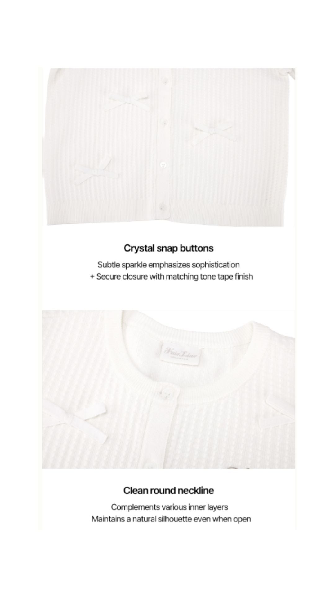 2. The front of the cardigan is adorned with small ribbon details, adding a feminine and charming vibe. The design features a classic silhouette with unique details for a stylish touch. Perfect for layering during the transitional season, this versatile piece can be styled effortlessly from everyday looks to casual outings.